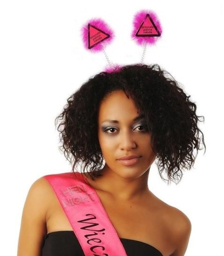 Opaska z różkami na sprężynkach z napisem ''Przyszła Panna Młoda''.