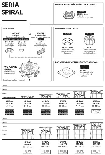 Zakres regulacji WSPORNIKA typu SPIRAL: 17-30 mm. W załączeniu podajemy pełną ofertę wsporników regulowanych typu SPIRAL z pełnym zakresem regulacji od 10 mm do 270 mm. Wsporniki tego typu mają regulację schodkową co 1mm. W zestawie motylki dystansowe o szerokości 3 lub 5 mm. W zamówieniu prosimy o podanie informacji o oczekiwanej szerokości motylków dystansowych. W przypadku zakupu wspornika do montażu legarów prosimy o informację aby wysłać wsporniki z adapterami do legarów.