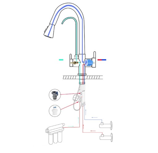 - Połączenie trójdrożne - ciepła zimna, możliwość podłączenia dodatkowej wody filtrowanej