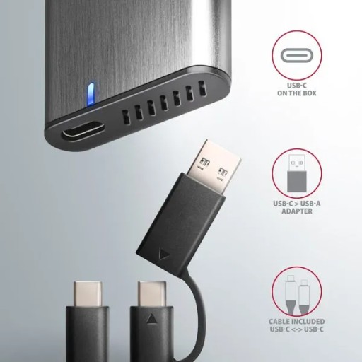 Wejście: USB 3.2 Gen 2 (USB 3.1 Gen 2) SuperSpeed USB 10 Gbps. Prędkość do 10 Gbit/s. Przyłączenie przez odwracalne złącze żeńskie USB typu C.