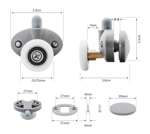 Rolka dolna do kabiny prysznicowej z łożyskiem kulkowym zapewnia cichą pracę. Korpus rolki został wykonany z wytrzymałego tworzywa sztucznego. Trzpień kółka wykonany ze stali nierdzewnej a opona kółka z tworzywa z domieszką kauczuku. Dodatkowo w prezentowanych rolkach istnieje możliwość wymiany samych kółeczek co pozwoli w przyszłości zaoszczędzić Państwu czas i pieniądze.