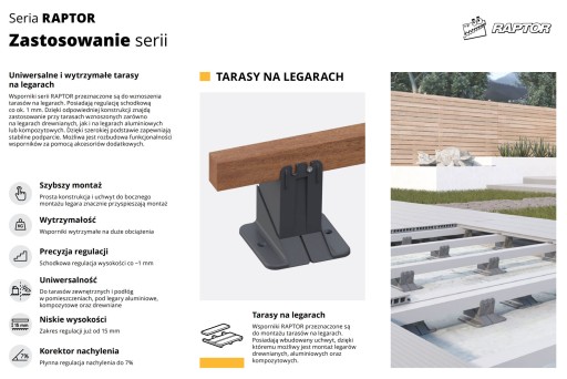 Wsporniki te przeznaczone są do wznoszenia tarasów na legarach. Posiadają regulację schodkową co ok. 1 mm.