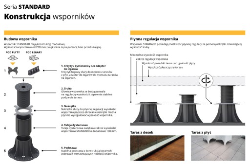 -WSPORNIKI REGULOWANE STANDARD w zakresie regulacji od 30 mm - 420 mm z płynną regulacją wysokości na gwincie oraz dodatkowo głowice samopoziomujące. Wsporniki regulowane dzięki dodatkowym adapterom znajdują zastosowanie do montażu legarów.