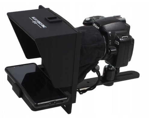 Dodatkowo w zestawie szyna do montażu aparatu/kamery, należy przykręcić ją jedną stroną do promptera a drugą do aparatu (śruba 1/4") a następnie nasadzić na niego kaptur promptera. Prompter można również zamocować na statywie fotograficznym z gwintem 1/4 cala.