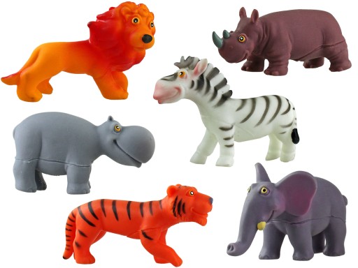 Cały zestaw zawiera 6 różnych, kolorowych dzikich zwierzątek, wykonanych z bardzo miękkiej gumy.