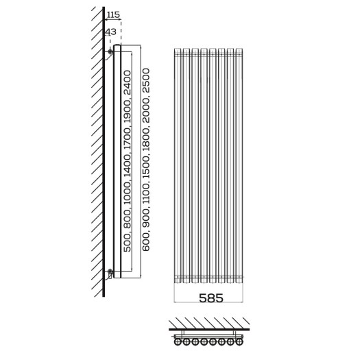W tym przypadku należy pamiętać, że nie ma możliwości wykonania grzejnika z zasilaniem dolnym centralnym o rozstawie 50 mm z racji przegrody, która uniemożliwi obieg wody w grzejniku. Kolektor pod grzałkę powinien być po przeciwnej stronie niż zasilanie.