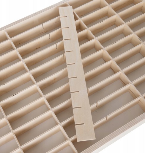 - SPECYFIKACJA – kolor: sosna; materiał: drewniana sklejka; ilość przegródek: 80; wielkość przegródki: 3,5 x 9,2 x 3,8 cm; wymiary 78,5 x 40 x 4,5 cm; waga: 2,276 kg; waga w opakowaniu: 2,507 kg.