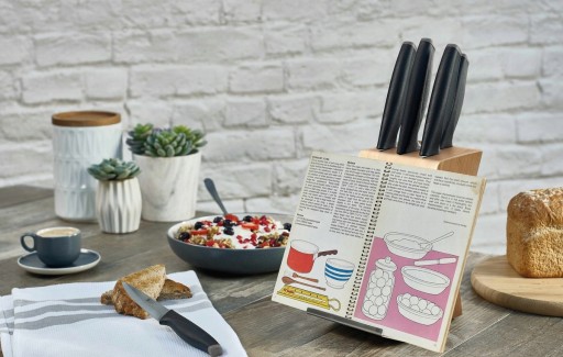 Blok posiada podstawkę na smarfon, tablet bądź książkę.