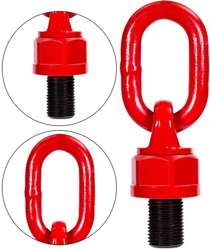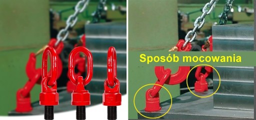 ZASTOSOWANIE: Śruba mocująca obrotowa z uchem do uniwersalnego zaczepienia dla wszystkich kierunków podnoszenia. Dedykowana jest do podnoszenia ładunków oraz bezpośredniego montażu uchwytu do ładunku. Umożliwia obracanie lub przechylanie ciężkich ładunków. Może być wykorzystana jako punkt mocujący do zabezpieczenia ładunku oraz do podnoszenia ładunku. Wykonane ze stali przystosowane do pracy w zakresie temperatur -40°C - +200°C bez obniżenia limitu obciążenia roboczego. Stanowią uzupełnienie dla elementów zawiesi łańcuchowych, naciągów, linowych, tekstylnych, do urządzeń dźwigowych, do ram pojazdów ,przyczep-naczep, a także w innych urządzeniach..