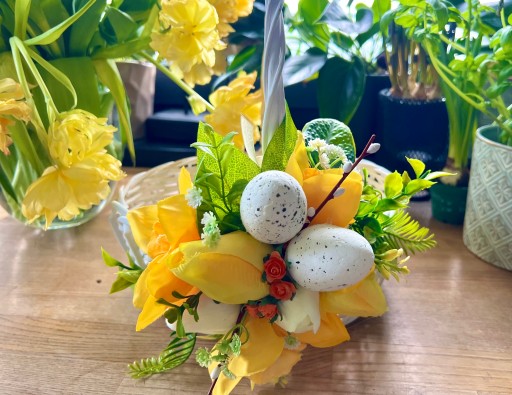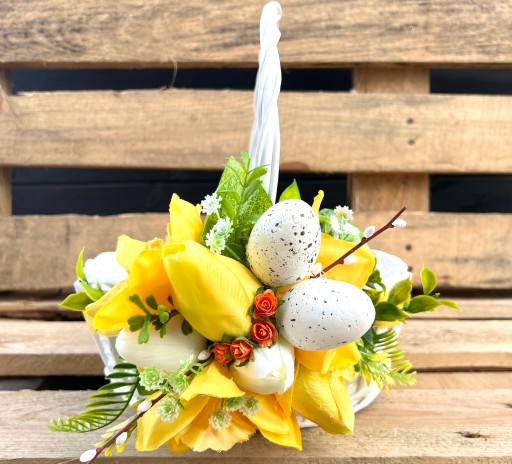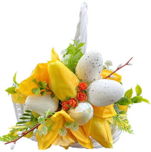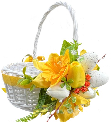 - w skład dekoracji wchodzą dodatki zielone, kwiaty, jajka styropianowe, bazie, wstążki,