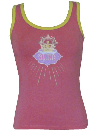 MODEL: BLUZKA NA RAMIĄCZKA BEZRĘKAWNIK RÓŻOWY Z ŻÓŁTYMI ELEMENTAMI I NADRUKIEM BLING E9