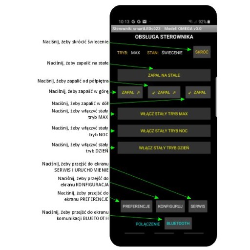 Poza normalnymi, sprzętowymi sposobami aktywacji sterownika (dowolne łączniki bezpotencjałowe typu przycisk lub czujniki ruchu z wyjściem bezpotencjałowym np. przekaźnikowym lub z wyjściem typu OC) dodatkowo istnieje możliwość obsługi instalacji z aplikacji: