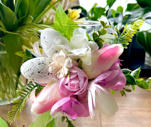 - w skład dekoracji wchodzą dodatki zielone, kwiaty, jajka styropianowe, piórka, wstążki,