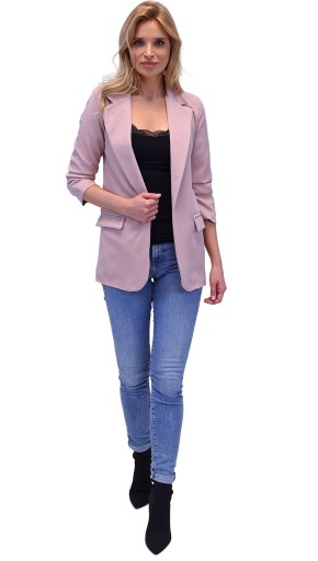Model dłuższy, smokingowy pasujący do eleganckiego jaki i casualowego stylu. Doskonałe dopełnienie stylizacji do pracy, na uczelnie lub na wieczorne wyjście. Oryginalnego charakteru dodają drapowane rękawy o długości 3/4. Dwie kieszonki po bokach z efektownymi klapami upiększają marynarkę. Fason luźny, z podszewką i miękkimi poduszkami w ramionach.