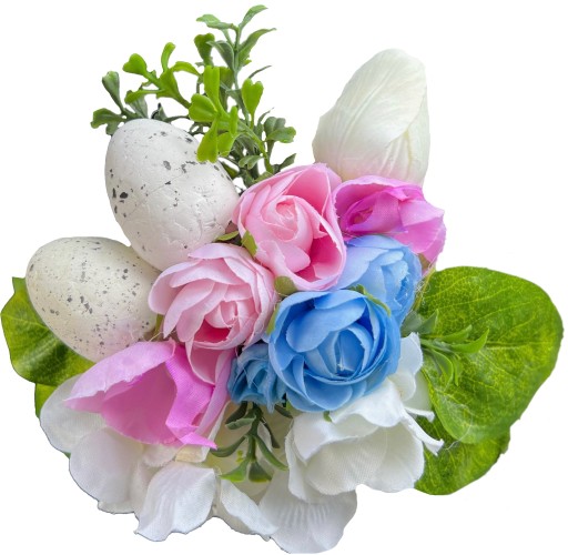 - w skład dekoracji wchodzą dodatki zielone, kwiaty, jajka styropianowe, wstążki,