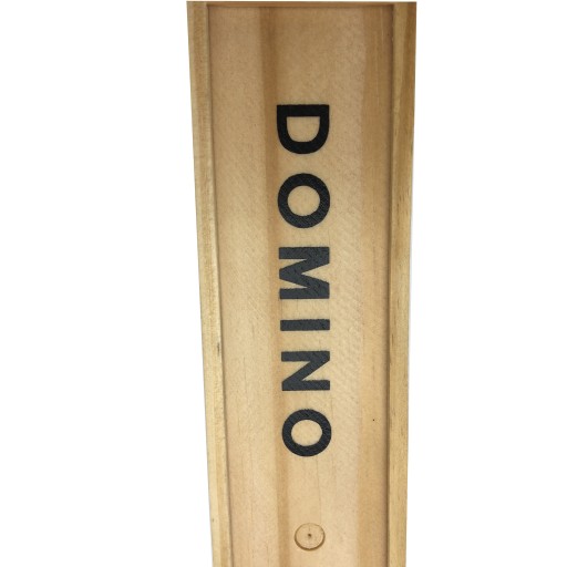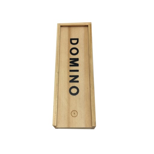 - Drewniane pudełko do przechowywania klocków z napisem "DOMINO"