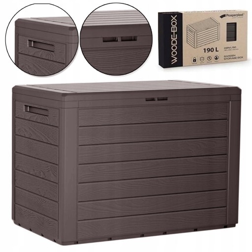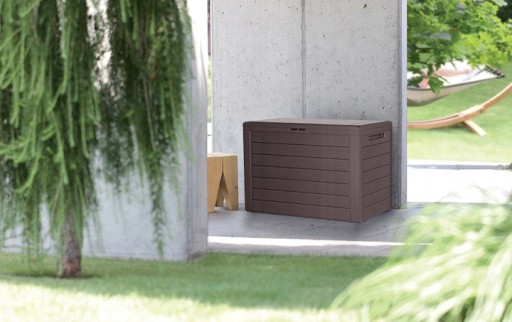 Praktyczna - skrzynia (kufer) ogrodowa wykonana z wytrzymałego tworzywa o fakturze naturalnych drewnianych desek. Sprawdzi się w domu, na balkonie, tarasie, w ogrodzie, w garażu czy szopie. Zabezpiecza przechowywania przedmioty przez kurzem i deszczem.