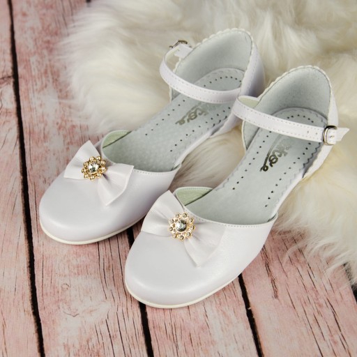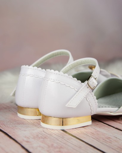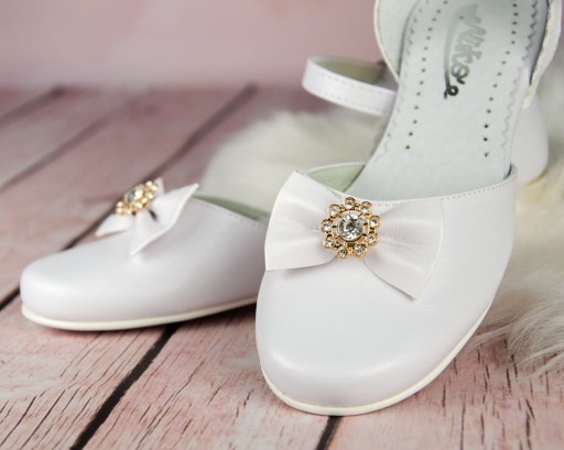 Klasyczne, białe buty komunijne dla dziewczynki, zapinane na regulowany paseczek ze sprzączką. Buciki dobrze wyprofilowane, dzięki czemu pewnie trzymają się stopy. Model na delikatnym obcasiku o wysokości 1,5 cm, w kolorze złotym. Uroku dodaje im piękna kokarda ze złotą ozdobą. Zewnętrzna część obuwia wykonana jest ze skóry ekologicznej, natomiast zapiętek i wkładka ze skóry naturalnej.