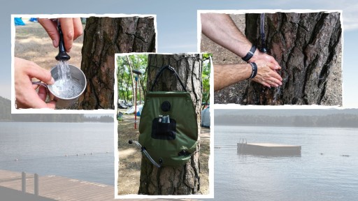 - ✅ Gumowa rączka umożliwiająca wygodne przenoszenie, a także zawieszenie - prysznic można zawiesić na każdym wystającym, stabilnym elemencie - np. uchwycie, drążku, rurze, a nawet gałęzi drzewa