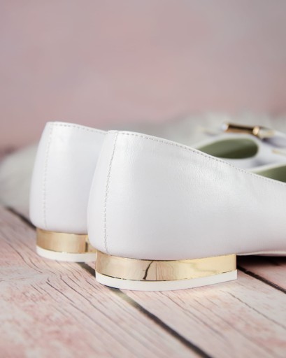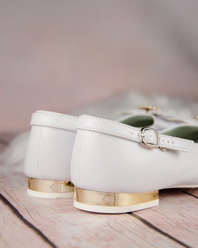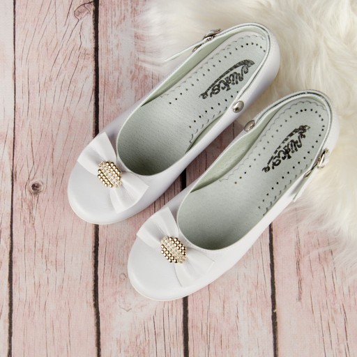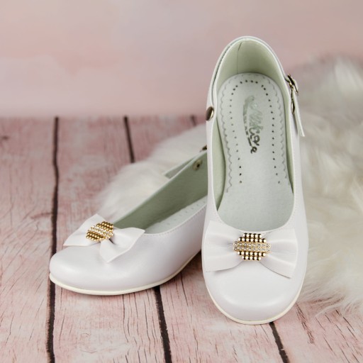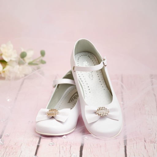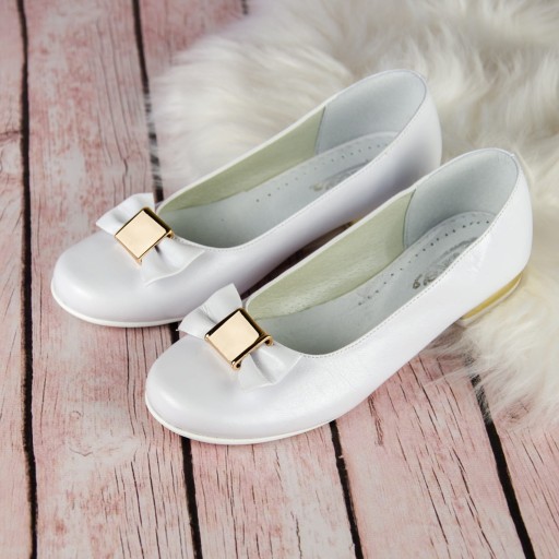 Eleganckie, wsuwane białe buty komunijne dla dziewczynki. Buciki dobrze wyprofilowane, dzięki czemu pewnie trzymają się stopy. Model na delikatnym obcasiku o wysokości 1,5 cm, w kolorze złotym. Uroku dodaje im piękna kokarda ze złotą ozdobą. Zewnętrzna część obuwia wykonana jest ze skóry ekologicznej, natomiast wkładka ze skóry naturalnej. Klasyczne baleriny idealnie sprawdzą się zarówno w dniu Pierwszej Komunii Świętej jak i w podczas innych uroczystości i nie tylko.