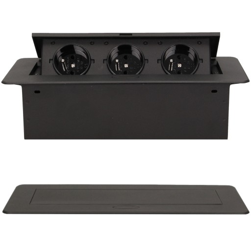 ✅ Zestaw trzech gniazd sieciowych z uziemieniem (typ french - z bolcem) i przesłonami torów prądowych w obudowie chowanej w blat. Urządzenie przeznaczone jest do montażu w biurkach, blatach i stołach, może być zamontowane zarówno w pozycji pionowej jak i poziomej zapewniając dostęp do gniazd elektrycznych.