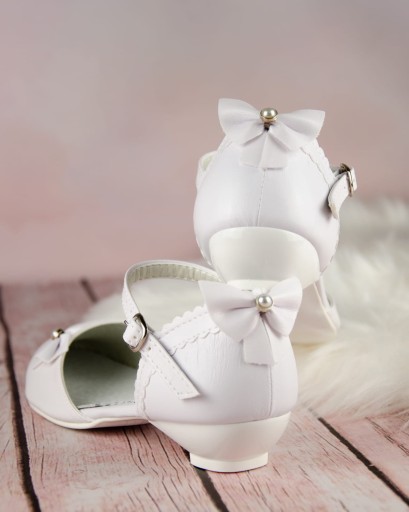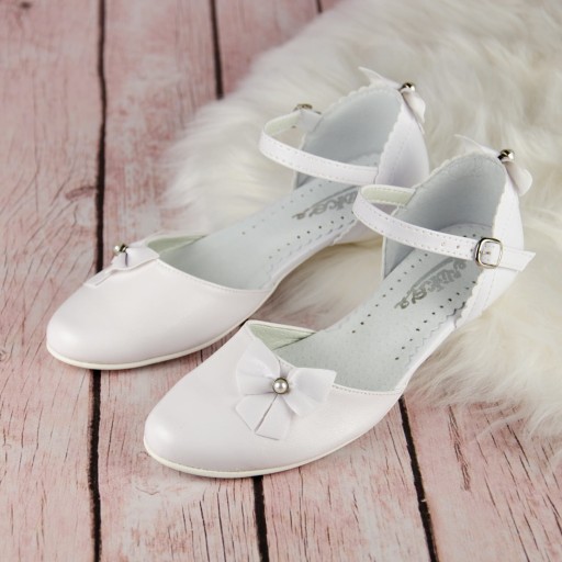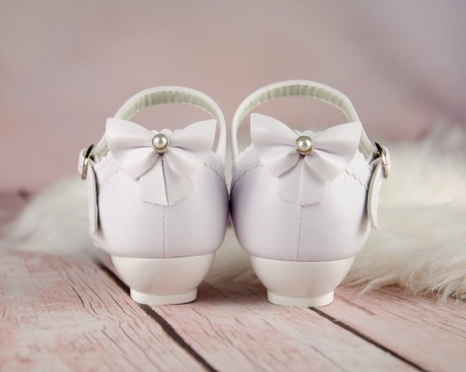 Eleganckie białe buty komunijne dla dziewczynki. Fason z zapiętkiem i regulowanym paseczkiem. Buciki dobrze wyprofilowane, dzięki czemu są bardzo wygodne. Model na delikatnym obcasiku o wysokości 2,5 cm, w kolorze białym. Uroku dodają mu kokardy przyozdobiona perełką, które umiejscowione są na przodzie cholewki oraz dodatkowo na zapiętku. Bardzo dziewczęcy model, który będzie pasował do większości sukienek oraz alb. Zewnętrzna część obuwia wykonana jest ze skóry ekologicznej, natomiast zapiętek i wkładka ze skóry naturalnej.