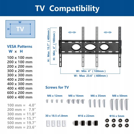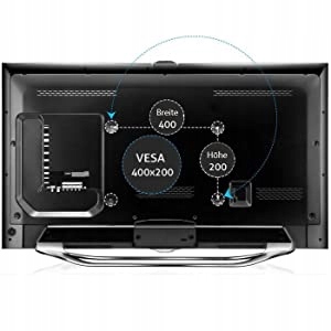Mierzona odległość to wymiar VESA, np. B. 100 x 100 mm, 400 x 200 mm, 325 x 325 mm, 500 x 300 mm. Odpowiedni wymiar VESA dla tego stojaka podłogowego telewizora: 100 x 100 do 600 x 400 mm.
