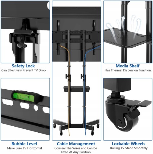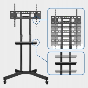 - Ten wszechstronny wózek telewizyjny jest idealny do użytku komercyjnego w biurach, szkołach, hotelach, lotniskach, laboratoriach, wystawach, szpitalach i nie tylko. Wspornik pasuje do większości telewizorów płaskoekranowych/LCD/LED od 32" do 70" o maksymalnym udźwigu 50 kg. Wspornik montażowy dopasowuje się na wysokość, aby pomóc Ci znaleźć idealny kąt widzenia. Szeroka konstrukcja podstawy zapobiega przewróceniu się stojaka, a dolna półka zapewnia dużo miejsca na odtwarzacz DVD lub inny sprzęt AV. Wyposażony w cztery wytrzymałe kółka, ten wózek pod telewizor jest bardzo mobilny; wbudowany mechanizm blokujący pozwala na nieruchomość lub mobilność w zależności od potrzeb. Zintegrowany system zarządzania kablami utrzymuje kable w ukryciu i zapewnia czyste środowisko. Montaż jest łatwy. Wszystkie niezbędne mocowania i instrukcje instalacji są dostarczane do instalacji.