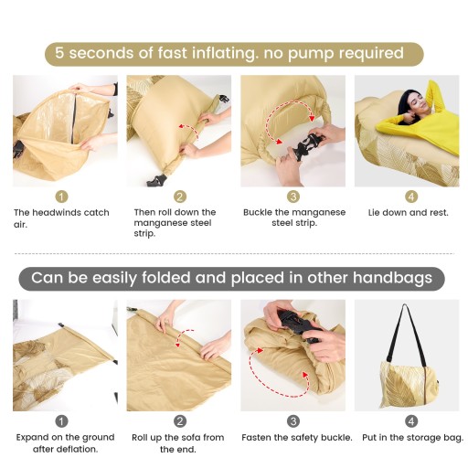 【Nie wymaga pompy, łatwe do napompowania】: naciśnij zatrzask bezpieczeństwa na klamrze, aby odblokować. Otwórz szeroko kieszeń kanapy i biegnij prosto pod wiatr, aby złapać powietrze (nie pompuj w kółko. Rotacja w miejscu nie może być pełna powietrza). Uwaga: musisz zatrzymać powietrze, zamykając otwór rękawa przed zakończeniem każdego ruchu i trzymać usta zamknięte do rozpoczęcia następnego ruchu. Następnie szybko zamknij kieszeń i zwiń ją tak ciasno, jak to możliwe, aż nie będzie można jej już zrolować. Zapnij klamrę zabezpieczającą i gotowe! Łatwiej będzie napompować w wietrzny dzień lub możesz poprosić o pomoc z wentylatorem, gdy jesteś w pomieszczeniu (Uwaga: BEZ PLASTIKOWEJ TABLICY).