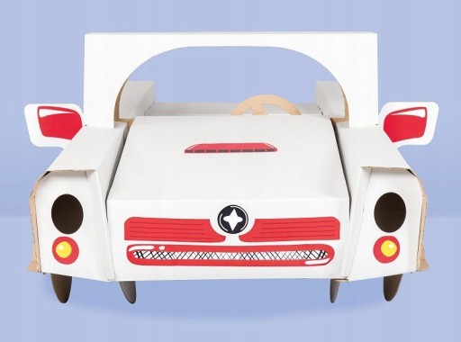 Samochód wykonany z 5-warstwowej, białej tektury falistej, do złożenia i oklejenia naklejkami.