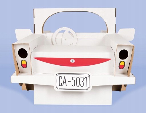 Samochód wykonany z 5-warstwowej, białej tektury falistej, do złożenia i oklejenia naklejkami.
