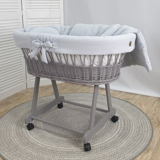 KOSZ MOJŻESZA — dedykowany niemowlakom do szóstego miesiąca życia. Ze względu na nieduże gabaryty i owalny kształt, otula maleństwo z każdej strony, dając mu poczucie bezpieczeństwa. Piękny, ręcznie pleciony, produkowany w Polsce produkt. W komplecie ze starannie wykonanym obszyciem, pościelą i materacykiem. Drewniane podwozie na kółeczkach pozwala na łatwe przemieszczanie go.