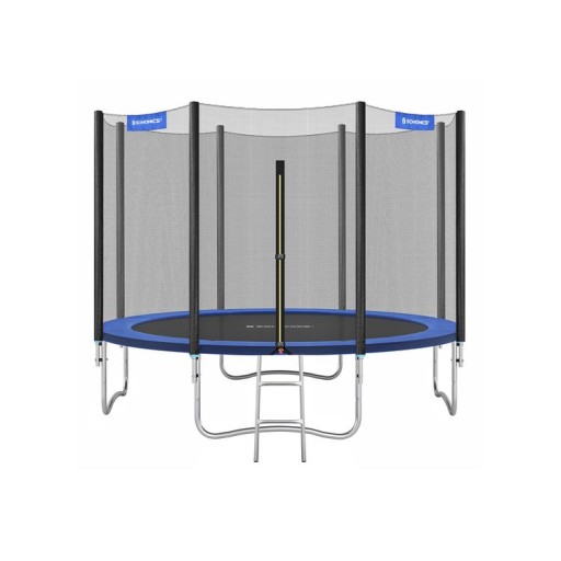 - Środki zapobiegawcze: W przypadku upadku wszyscy wolelibyśmy uderzyć w miękką siatkę lub podkładkę niż w twardy metalowy słupek. Dlatego słupki tej trampoliny są wyposażone w miękką wyściółkę z pianki. Gęsta siatka asekuracyjna o wysokości 1,8 m zapewnia również, że nie wystartujesz