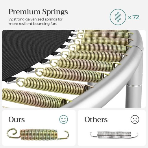 - Zawsze o krok do przodu: rama trampoliny wykonana jest ze stali ocynkowanej i ma grubość 1,2 mm. Mocowana jest również do nóg trampoliny za pomocą trójników, co zapewnia większą stabilność, a tym samym sprężystość
