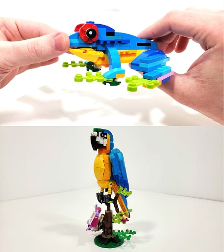 Dzięki zestawowi LEGO Creator z ruchomą papugą, rybą i żabą dzieci przeniosą się do kolorowego lasu deszczowego.