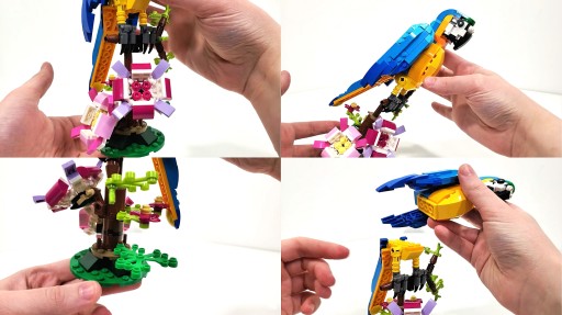 Zawiera on kolorową papugę, która może obracać ciało, siedząc na gałęzi, a także poruszać skrzydłami i ogonem. Trzy zabawki w jednym zestawie do kreatywnej zabawy Zestaw 3 w 1 umożliwia dzieciom zbudowanie trzech różnych egzotycznych zwierząt.