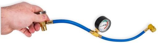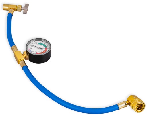 Przewód z manometrem jest niezbędny do uzupełnienia systemu klimatyzacji. Po podłączeniu do zaworu niskiego ciśnienia uzyskamy na manometrze odczyt pomiaru ciśnienia. Jest wielorazowego użytku, dzięki czemu nie zaśmieca środowiska.