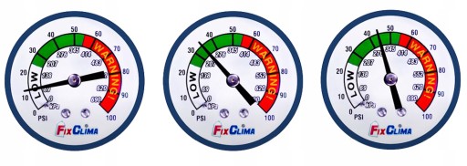 ⚠️ Kolor BIAŁY - zakres 0-25 PSI: zbyt niskie ciśnienie w instalacji. Należy uzupełnić czynnik.