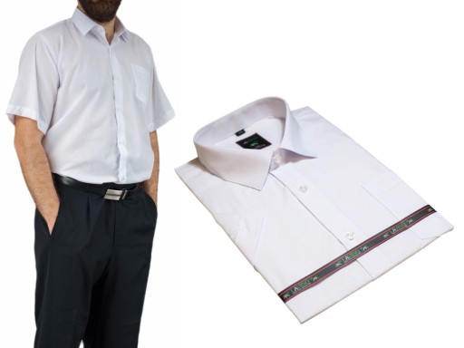 Koszula męska z krótkim rękawem o prostym, klasycznym kroju regular, bez taliowania i zwężania w pasie. Materiał z jakiego wykonano koszule stanowi mieszankę bawełny i poliestru dzięki czemu koszula dobrze się prasuje, jest miła w dotyku i łatwo się pierze. Koszule tego producenta mają bardzo dobry stosunek jakości do ceny.
