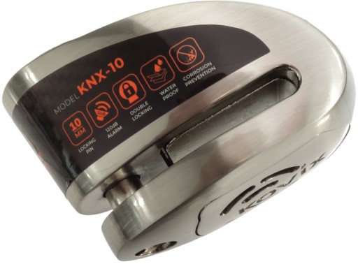 Blokada tarczy hamulcowej KOVIX KNX10 z wbudowanych alarmem o natężeniu dźwięku 120 dB z możliwością ustawiania opcji syreny ON/OFF. Zamek ze stali nierdzewnej i wodoodporne podzespoły elektryczne gwarantują ochronę przed korozją i niezawodność w każdych warunkach atmosferycznych. Blokada wyposażona jest w długo pracującą i przyjazną dla środowiska litową baterię. Zabezpieczenie blokuje koło bolcem o średnicy 6 mm, przez co uniemożliwia jazdę i ruch motocykla lub skutera.