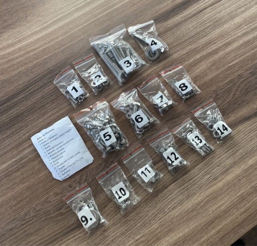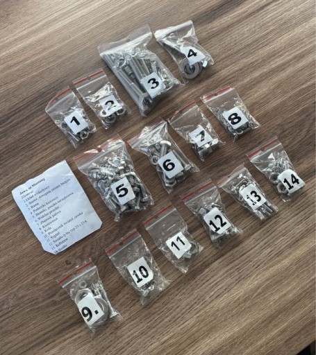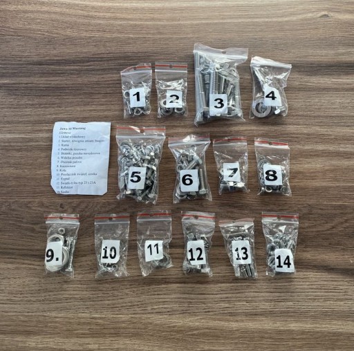 Śruby wykonane w klasie A2, w skład kompletu wchodzą śruby, wkręty, nakrętki i podkładki podzielone na 14 osobno spakowanych grup które są podpisane - umożliwia to bezproblemowy montaż poszczególnych elementów do motocykla.