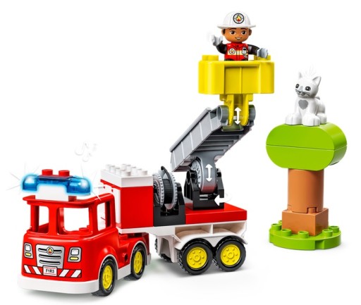 Kot utknął na czubku wysokiego drzewa! Wóz strażacki z błyskającymi światłami i głośną syreną pędzi na ratunek (baterie w zestawie). Młody bohater może popchnąć i obrócić dźwignię na wozie strażackim, by podnieść drabinę i obrócić kosz znajdujący się na jej szczycie. Jeśli przestraszony kot nie będzie chciał się ruszyć, może skuszą go smakowite przysmaki. A jeśli to nie pomoże, trzeba będzie sięgnąć po wąż strażacki! Uroczy zwierzak do uratowania oraz sympatyczny strażak z tego praktycznego zestawu pomogą dzieciom rozwijać zdolności społeczno-emocjonalne oraz koordynację wzrokowo-ruchową przez odgrywanie ról związanych z realistycznymi przygodami bohatera dnia codziennego.Nauka przez zabawę dla maluchówDzięki zabawkom LEGO DUPLO rodzice mogą uczestniczyć w każdym etapie rozwoju swoich maluchów i zachęcać dzieci do swobodnej zabawy, wyrażania siebie oraz wesołego odkrywania świata.