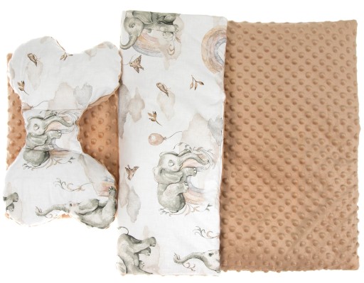 Wszystkie elementy zestawu są dwustronne, z jednej strony jest mięciutki materiał minky a z drugiej wzór bawełniany.