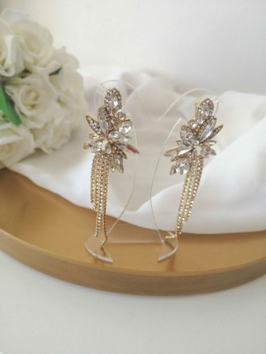 Najmodniejszy wzór długich, wiszących kolczyków ślubnych i wieczorowych. Cyrkonie w różnych kształtach i rozmiarach tworzą wyjątkową i pięknie połyskującą całość. Idealne na wyjątkową okazję, jaką jest dzień ślubu. Na pewno nie zostaną niezauważone, przy czym są lekkie i nie obciążają ucha podczas noszenia.