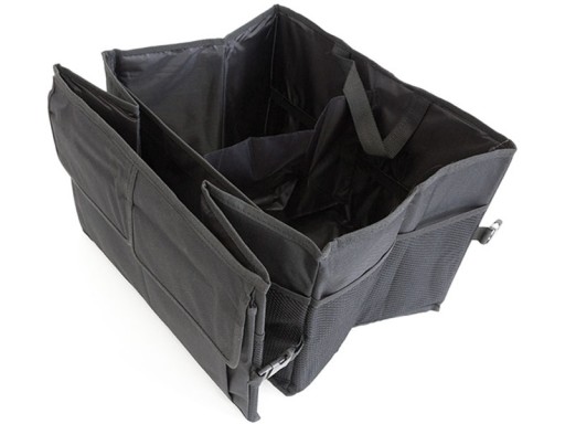 Torba, organizer, postawiony w bagażniku samochodu zmieści przydatne rzeczy, które często wozimy w aucie. Po złożeniu nie zajmie wiele miejsca. W razie konieczności można rozłożyć tylko połówkę organizera dzięki zatrzaskom. Ma praktyczny, czarny kolor i wygodne, mocne uchwyty.