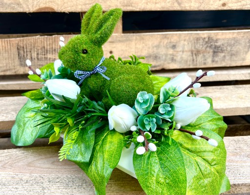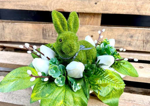Oferujemy Państwu piękny, wielkanocny stroik z zającem w roli głównej. W cenie otrzymujesz stroik w skład którego wchodzi :