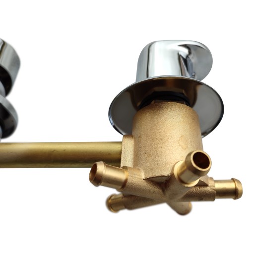 Solidna, mosiężna bateria do kabiny prysznicowej z hydromasażem / paneli prysznicowych i natryskowych posiadająca z jednej strony podłączenia do zimnej oraz ciepłej wody na wężyki 1/2" (mieszacz) a z drugiej strony na 3 funkcje / źródła natrysku na obejmy zaciskowe (rozdzielacz funkcji) jak np. na: