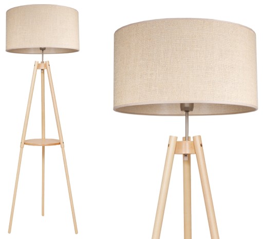 Nowoczesna drewniana lampa stojąca z abażurem na trzech nogach z półką to stylowa rodzina lamp wykonana z najwyższej jakości drewna.
