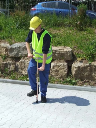 Łom brukarski Probst do pozycjonowania i wyrównywania kostki brukowej oraz innych elementów . Wyposażony został w dwa uchwyty, belkę nożną i powierzchnię do wbijania młotkiem w fugi kostki brukowej.