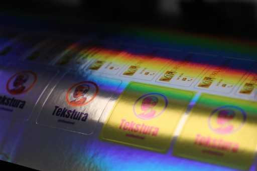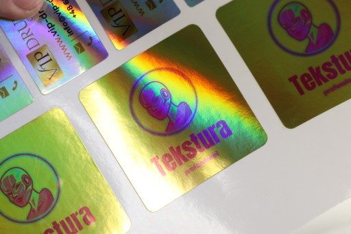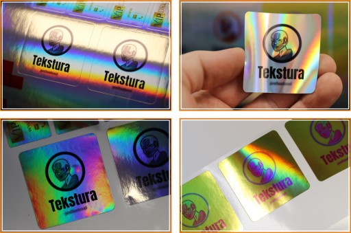 Naklejki drukowane na foli holograficznej inaczej też nazywanej folią pryzmatyczną przy zmianie konta nachylenia mienią się w kolorach tęczy tak jak to widać na zdjęciach obok.
